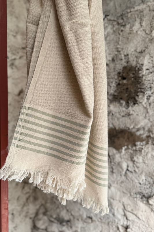 TELO TERRA: lino e cotone color sabbia e bande verde oliva