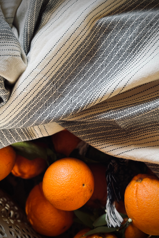 • TELO LUNA: lino e cotone a bande nere e righe corallo